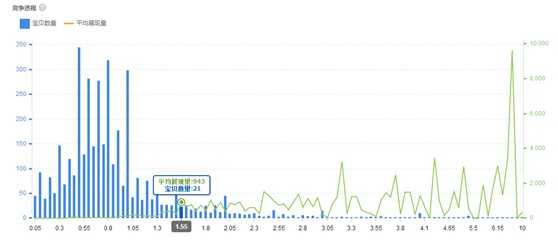 如查询婚纱礼服这个关键词,通过竞争透析数据我们看到当出价1.5元时宝贝数量是68,平均展现量是237:;而当出价1.55元时,只是提价了0.05,此时的竞争宝贝数量就降到了21个,平均展现量提高到了943,出价只提高了0.05,竞争就少了3倍,这是不是就很值得了呢?