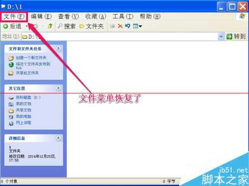8、最后,重启一次电脑,然后来到资源文件夹窗口,这时,文件菜单就出现在窗口上了,说明修改注册表成功。