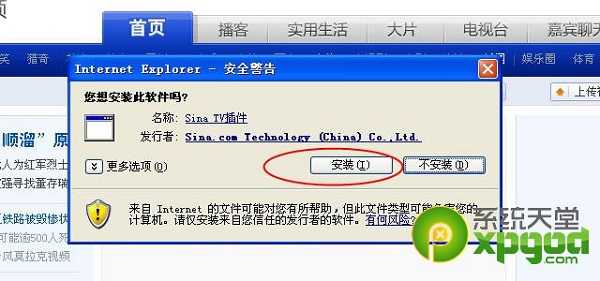 1、点击浏览器栏的提示,在页面进行sina tv 插件的安装: