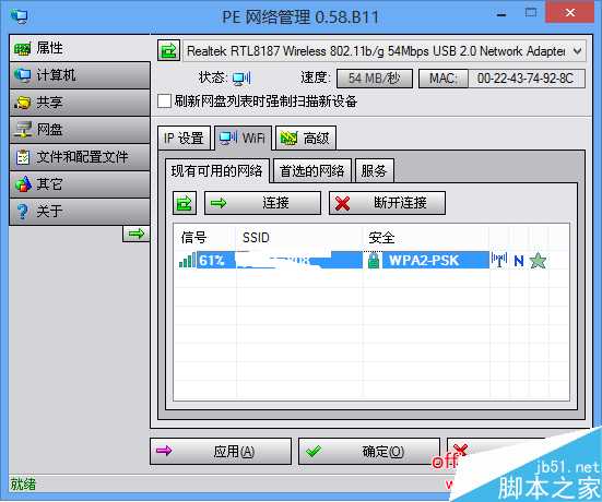 返回桌面启动“网络管理Penetwork”,在打开窗口的网卡列表中选中安装的网卡,切换到Wi-Fi点击“启动”,这样会自动搜索当前热点,按提示进行连接即可,成功连接后就可以在WinPE中上网了(图8)。