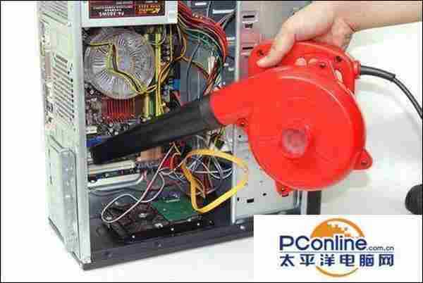 打开吹风机或者是专业的除尘器,冲着主机内部吹,特别要吹的是电源、芯片、显卡、机箱后部的风扇处。