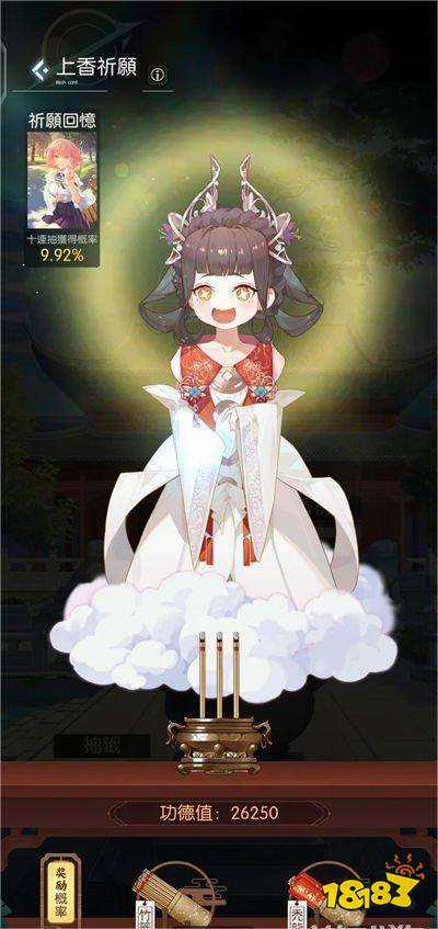 首先是很关键的一个外出——寺庙——上香,这个是提升单卡获得概率,不是其他游戏的up提升(获得SSR时此卡概率提升),所以前期通过上香可以获得一下不错的卡牌,建议提升到20%左右开抽,不建议用龙涎香500钻还是挺贵,不过里面的卡有限,个人推荐旗袍夏冰(纯粹伤害,还能回血)。